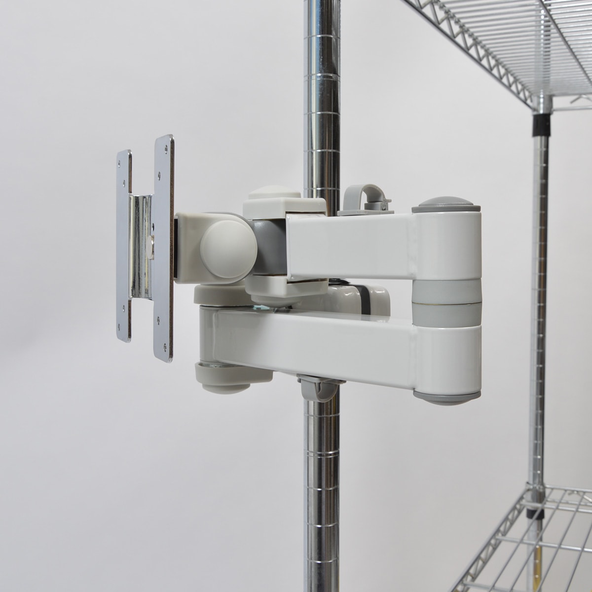 パソコンを置くための机として、ポールラックを使っているお客様も多いと思われますが、通常のモニターアームは机の面に挟んで設置する為、アームを設置し たいと思ってもご利用いただけませんでした。