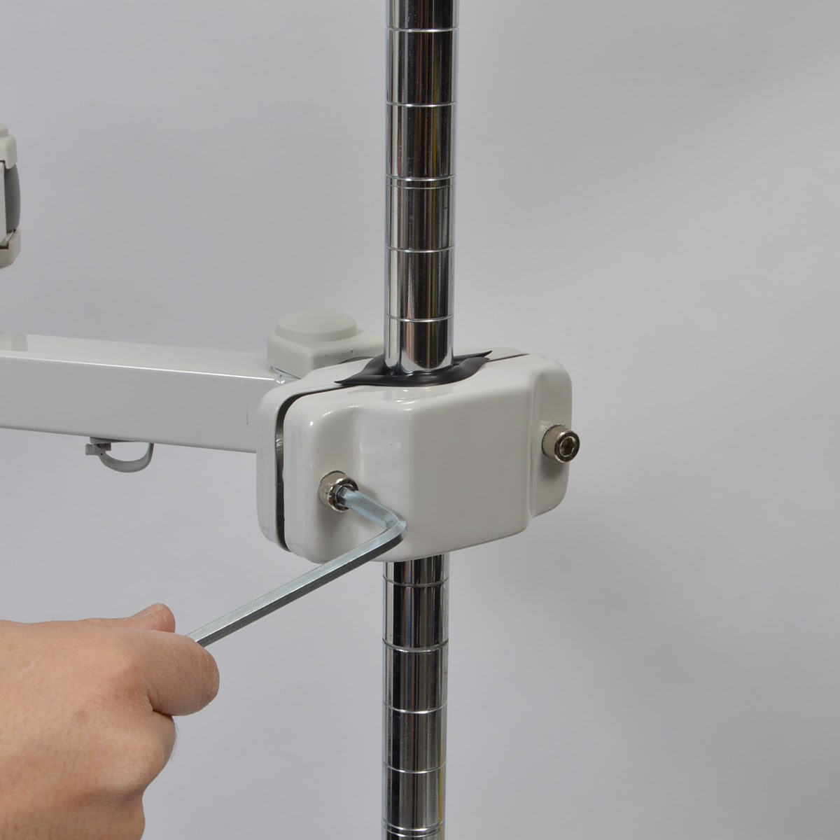 ポールやメタルラックなどに取り付けるアームは、付属の六角レンチで2つのネジを締めるだけで固定できるので、簡単。