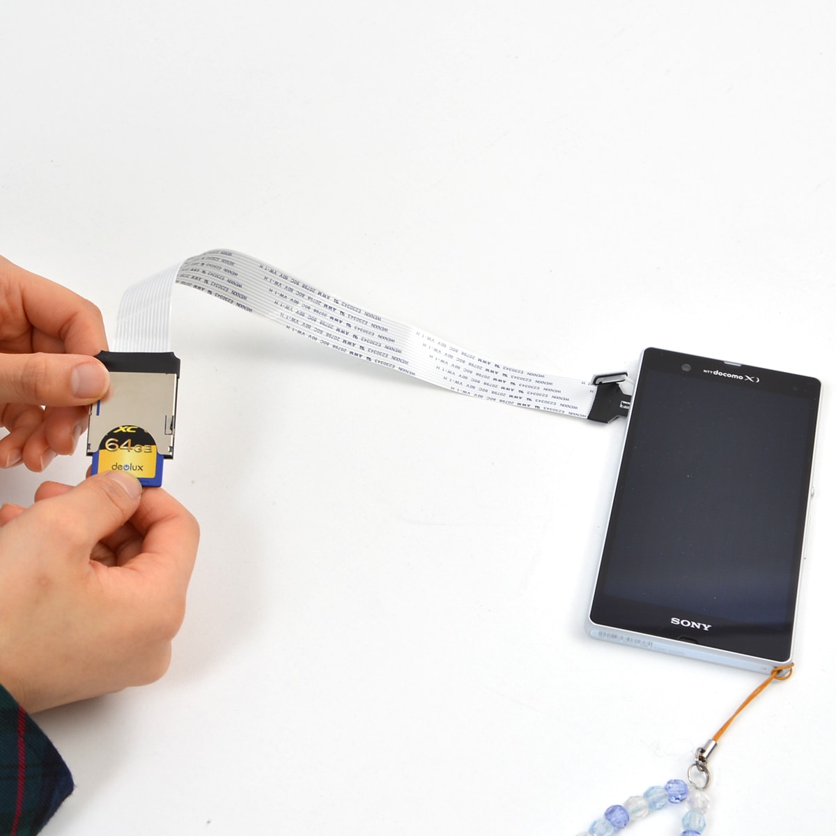 また、【SD-microSD変換エクステンションケーブル】も、スロットの位置を変更するだけなのですが、スマホなどのmicroSDスロットに接続すれば、デジカメで撮った写真データなどの入ったSDカードを直接読み込むことができ、パソコンや無線を使わずデータのやりとりができるため、大変便利です。