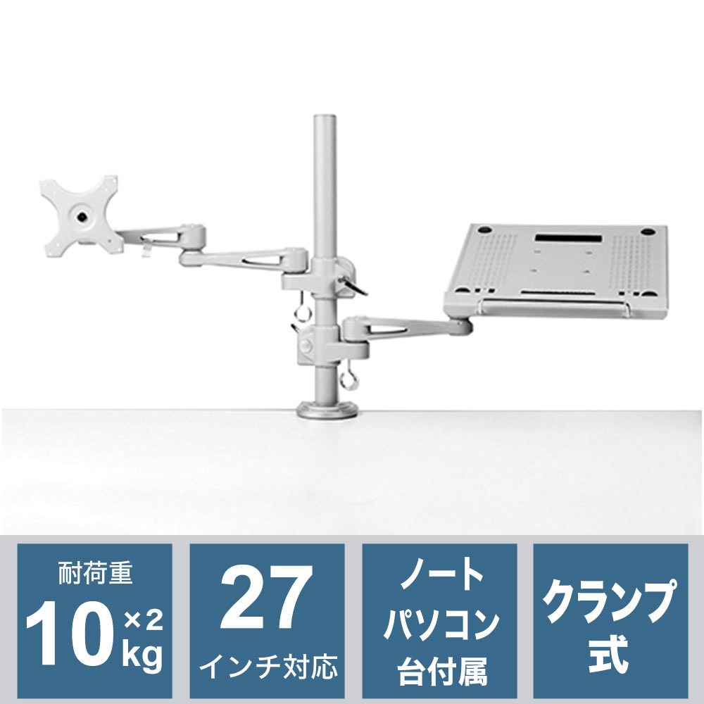 ノートパソコンとサブモニタを一緒に搭載可能なアームです。