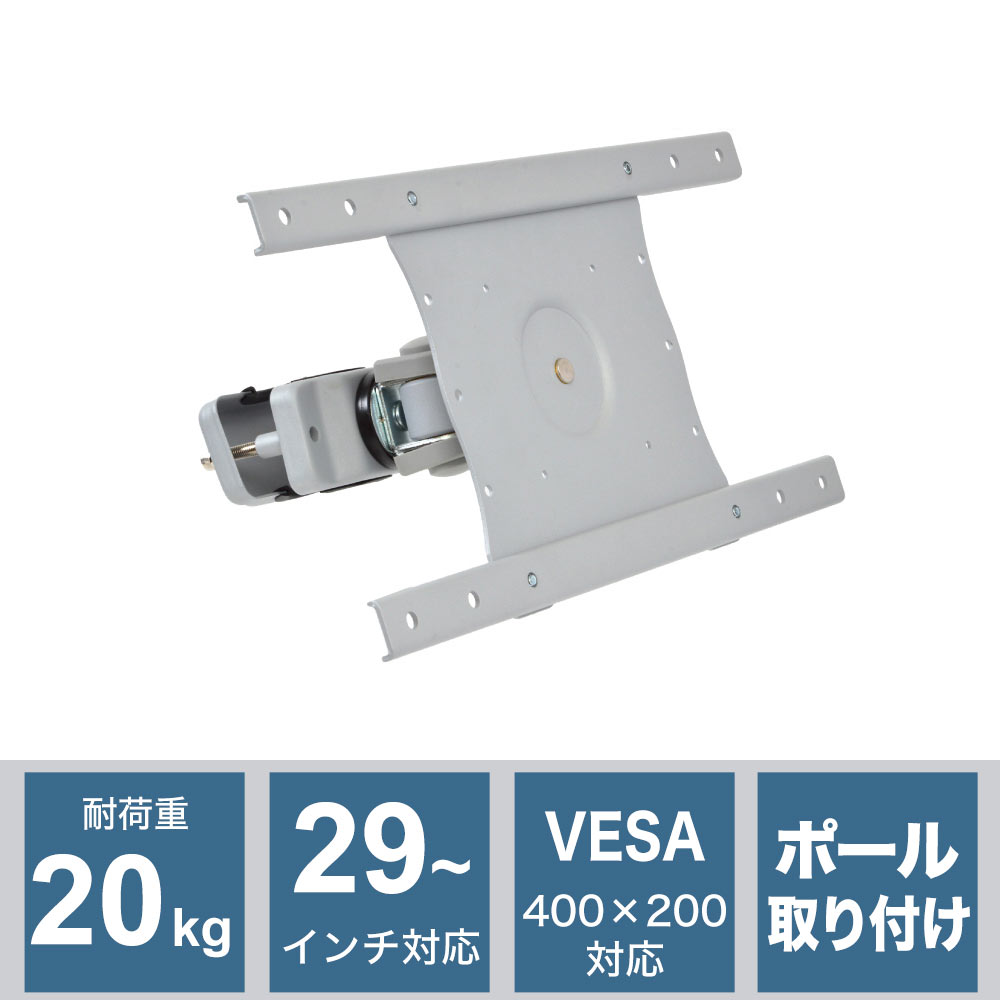 VESA規格(ねじ穴位置)100×100、200×200、200×300、400×200に対応し、耐荷重も20kgなので、色々なポールに大型モニターを取り付けることができます。