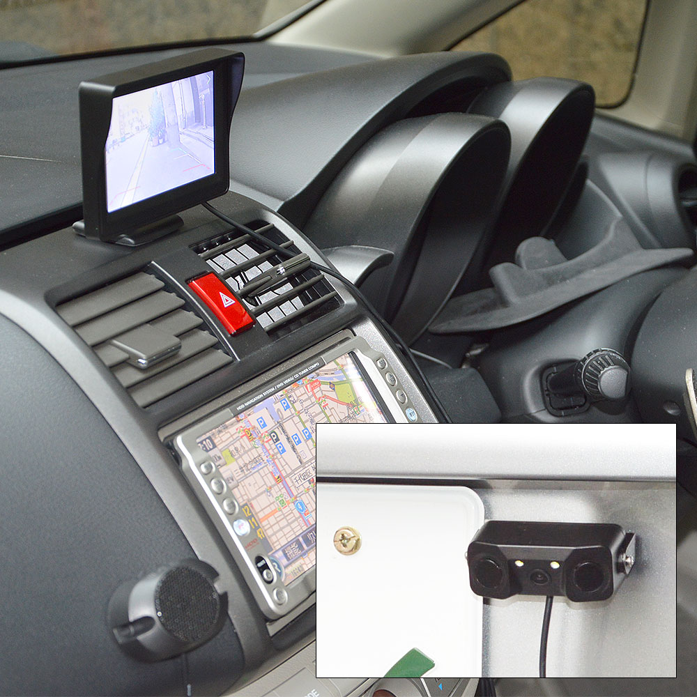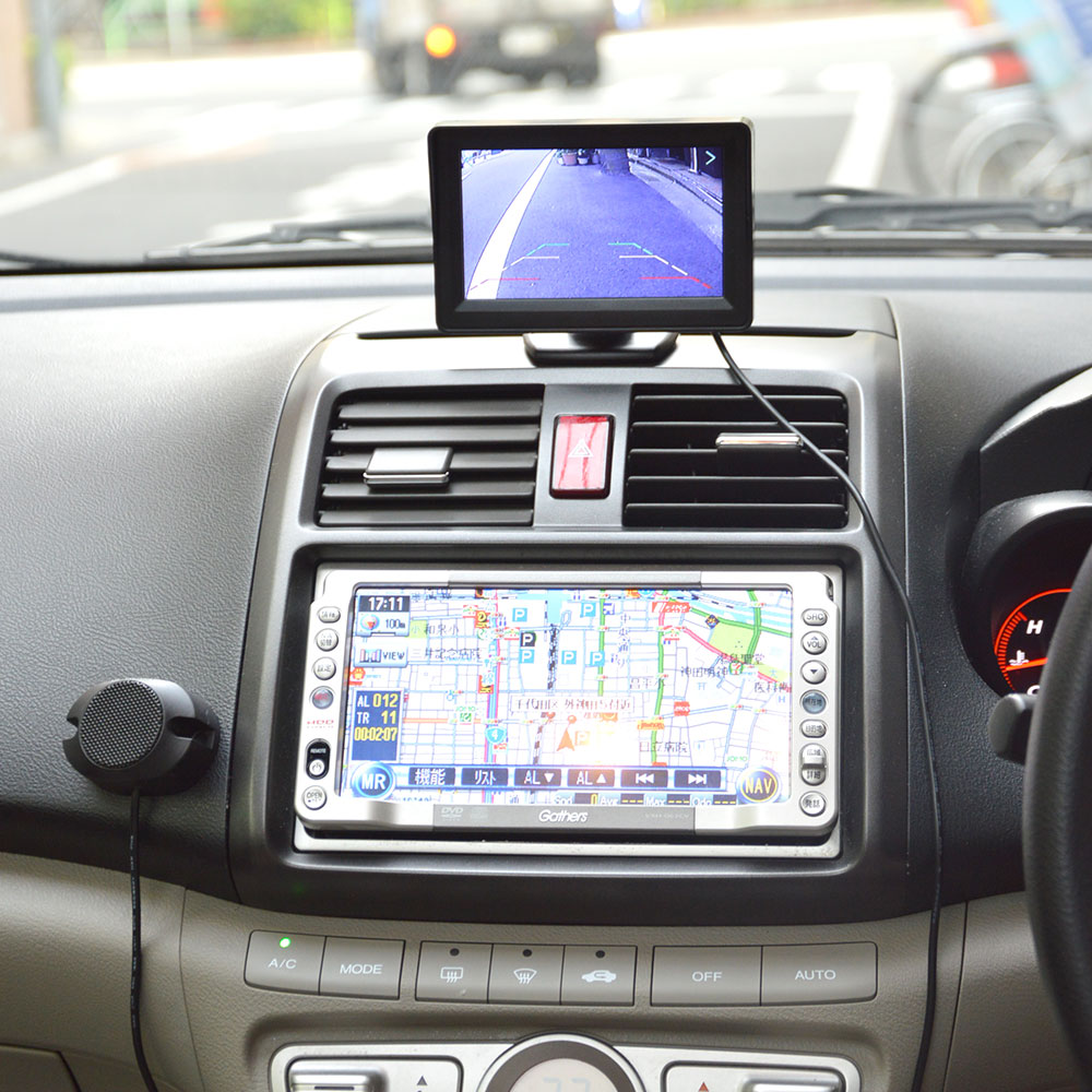 本製品の取付は非常に簡単です。モニター、スピーカー、カメラ&センサーを設置したらケーブルで繋ぐだけ。車本体に穴を開けたりする必応はありません。