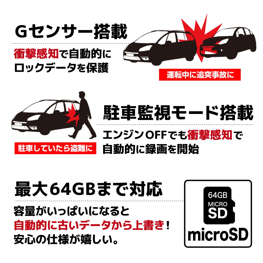 Gセンサーや駐車監視モード付で、万が一の場合も安心。