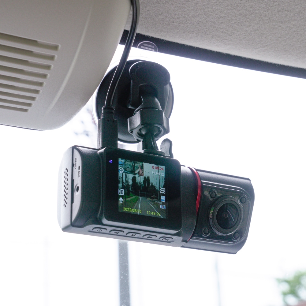 デュアルレンズのドライブレコーダーで、前方に加えて車内を同時撮影!