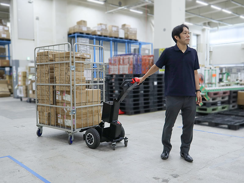 倉庫内での荷物の運搬作業を効率的に、かつ安全にサポートする電動アシスト機能がついた電動牽引車です。