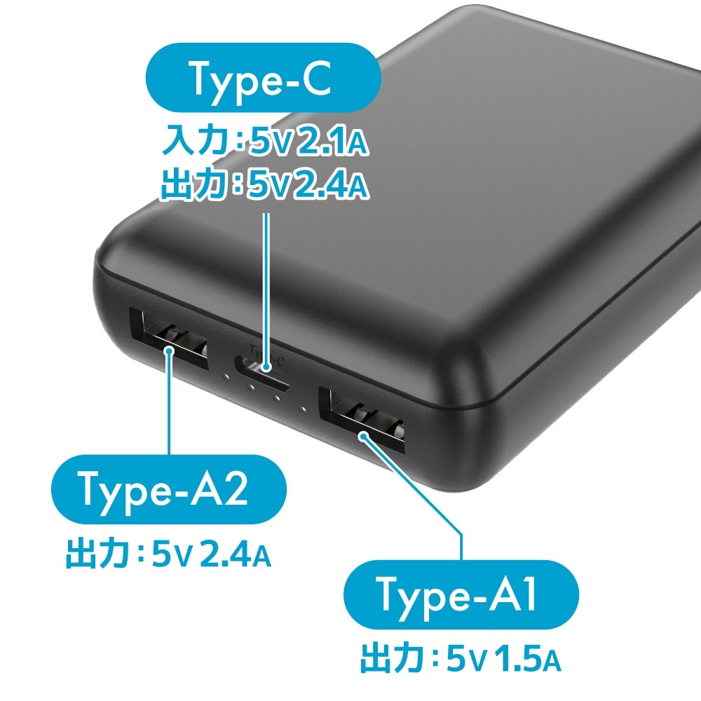 | 定格出力(充電) | Type-C:5V 2.4A(MAX) Type-A1:5V 1.5A(MAX) Type-A2:5V 2.4A(MAX) 合計最大5V 2.4A |
