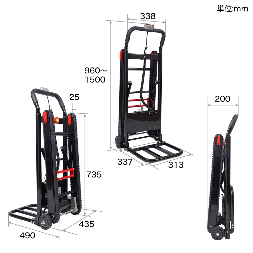 折り畳み時: 幅435×奥行200×高さ960(mm)重量 約12kg 最大積載量 45kg 荷台サイズ 幅313×奥行337(mm) ハンドル 伸縮 :4 段階調節(最大 540mm 延長) 最大階段角度 35 度 昇降速度 上昇時:25段/分 下降時:25段/分(約 20kg の荷物を載せて計測 ) モーター/出力 24V 80W バッテリー 24V 6400mAh 充電時間 約 3 時間 連続使用時間 約50分(45kg の荷物を載せて上昇した場合) 使用耐久目安 6階建ての階段を一回上がって下りて(1日1回)、1800回程度 充電器 入力 :AC100-240V,50/60Hz 出力 :DC29.4V 2A 58.8W セット内容 台車(バッテリーセット済)、収納袋(荷締めベルト、充電アダプター、電源コード)、日本語取扱説明書 注意事項 ★走行ベルトが外れる可能性があるため、らせん階段等、曲りながら登る階段はご使用いただけません。