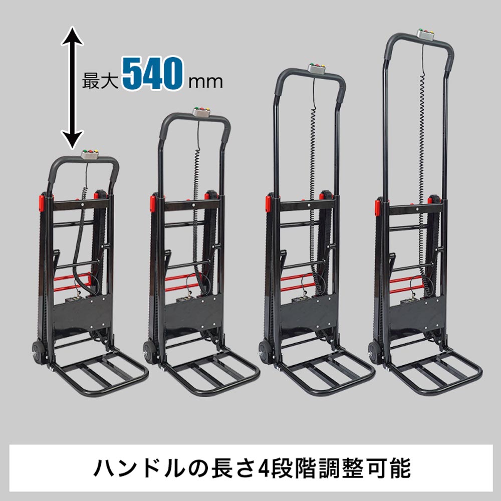 ハンドルは、4段階で伸縮することができるので、屈まず立って階段を昇り、安定した運搬をすることができます。