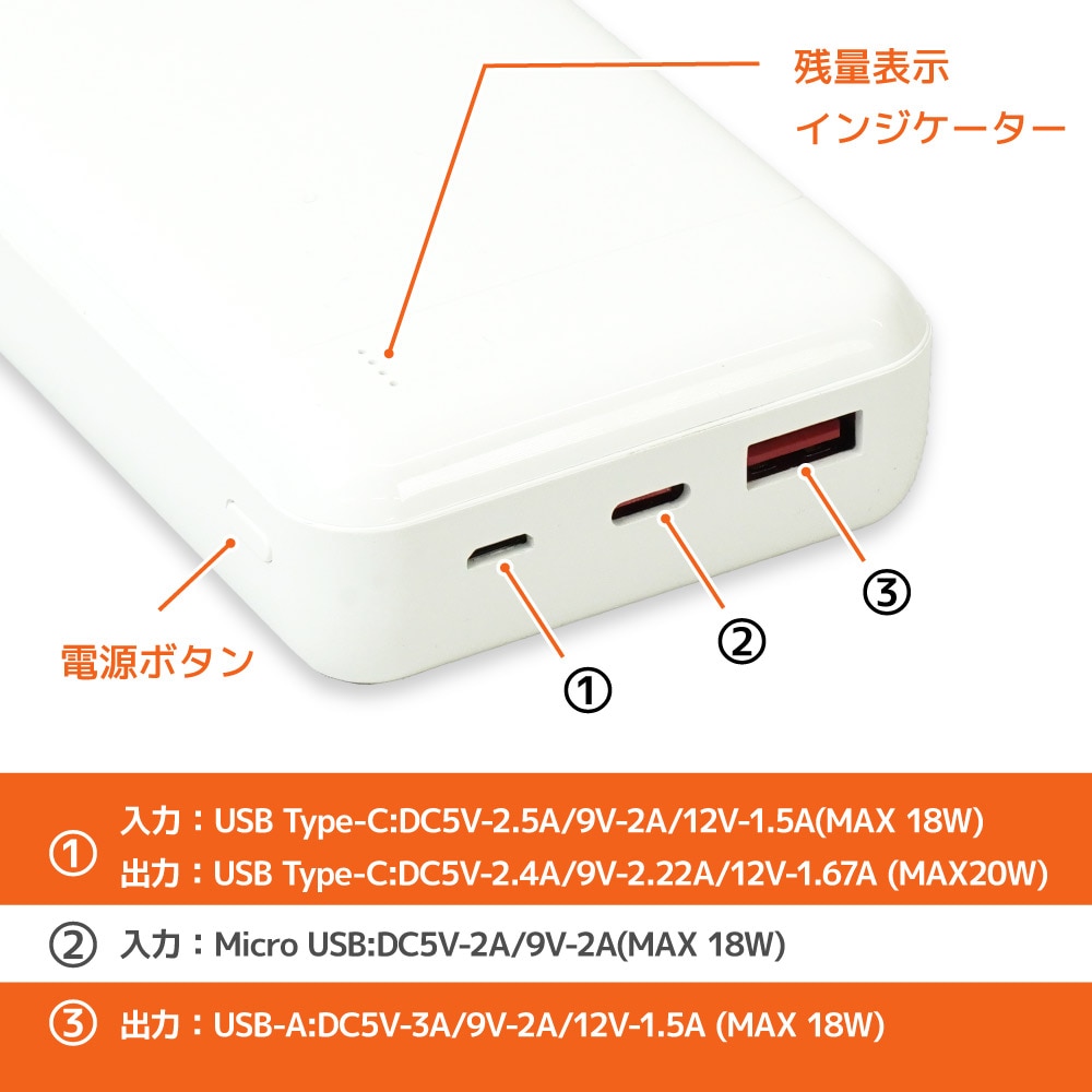 | 定格入力 | Type-C:DC5V/2.5A, 9V/2A, 12V/1.5A(MAX 18W) Micro USB: DC5V/2A, 9V/2A(MAX 18W) |