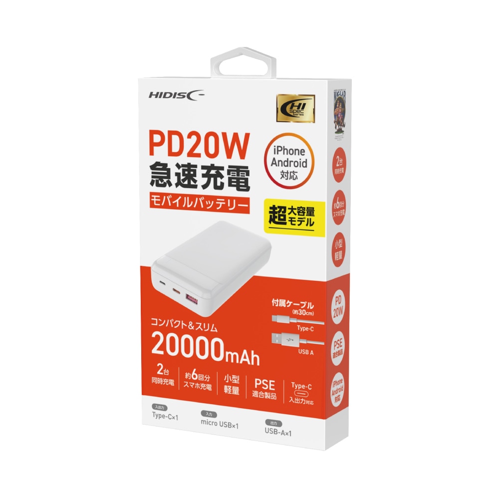 HIDISC PD20W, QC3.0対応 20000mAhモバイルバッテリー ホワイト