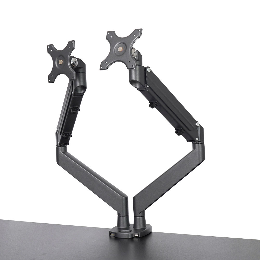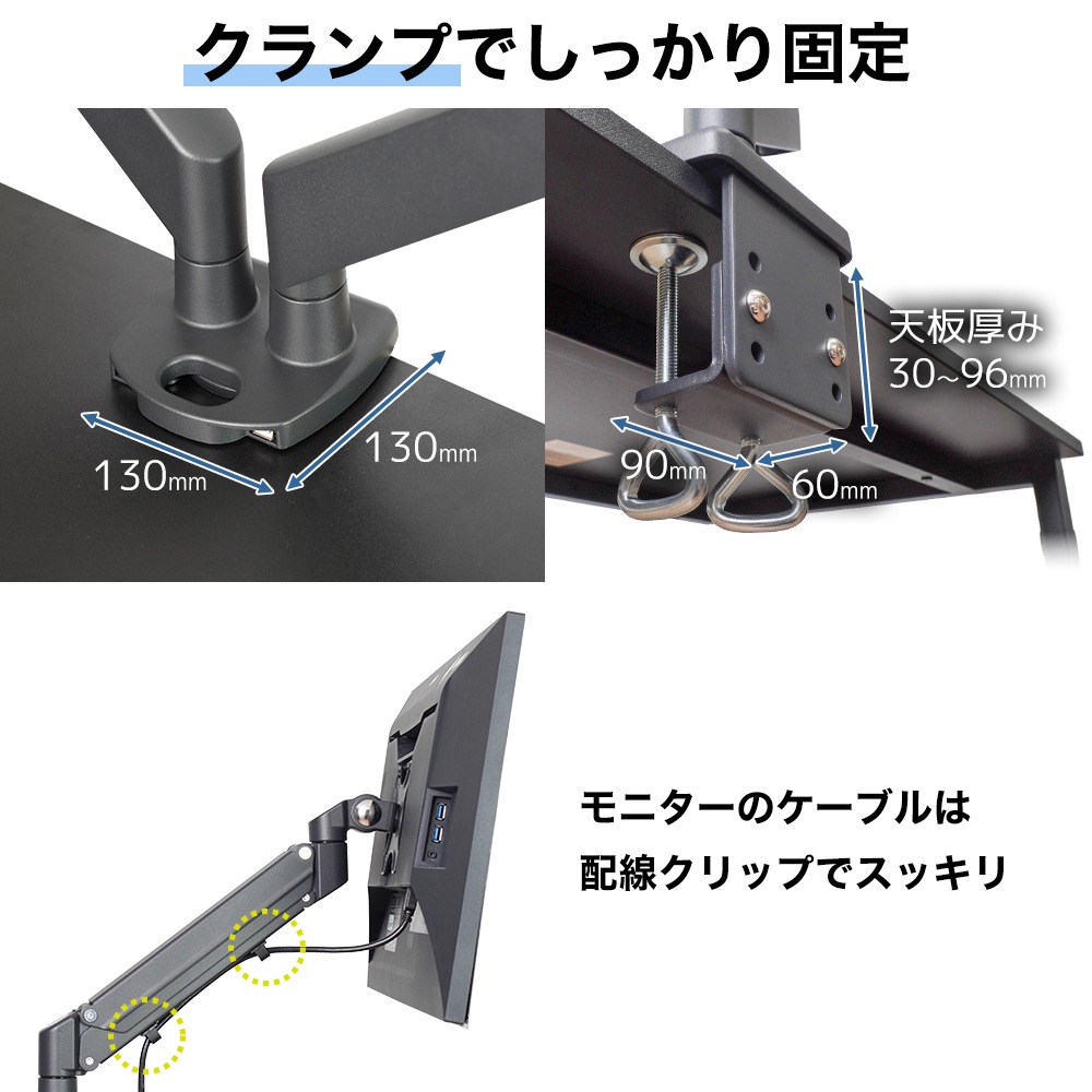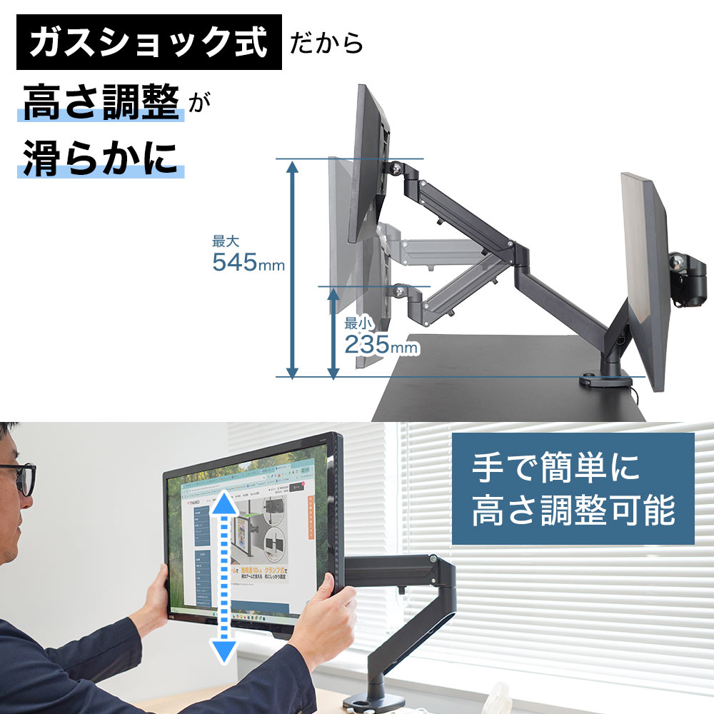 工具を使わずに高さ調整ができる、USB延長ケーブル設置可能なガスショック式モニターアーム2面タイプ