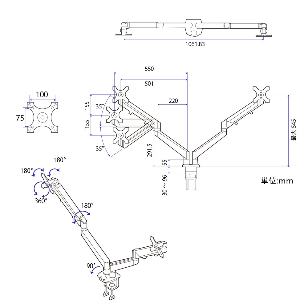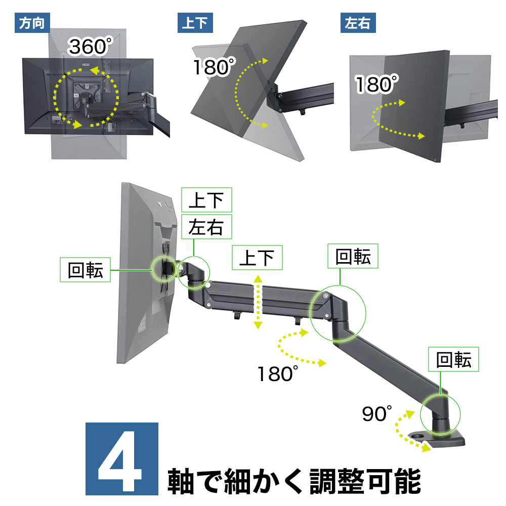| セット内容 | モニターアーム本体、クランプ部、六角レンチ(大・小)、ボルト(M4×10)8本、ボルト(M8×12)2本、組立説明書 |