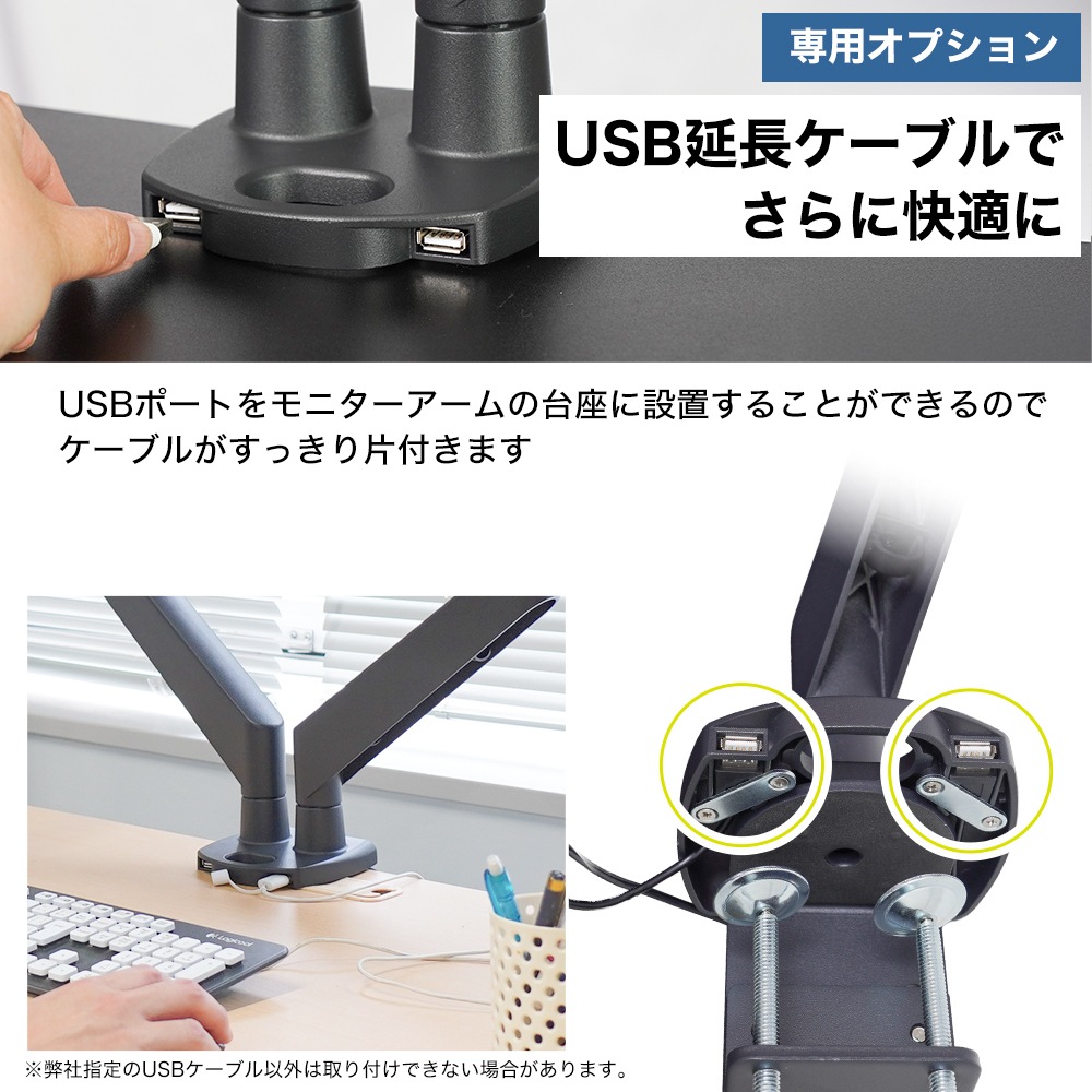 モニターアーム本体に別売のUSB延長ケーブルを取り付けることで、邪魔にならない場所にUSBポートの設置ができます。